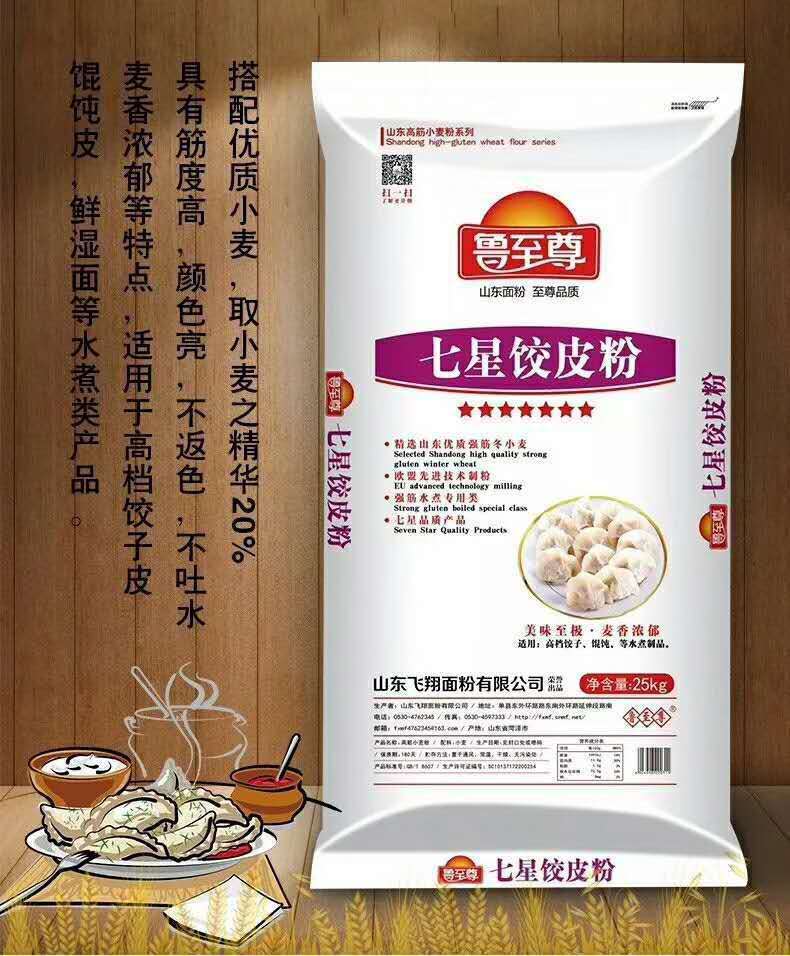 鲁至尊七星饺皮粉:具有筋度高、颜色亮、不返色、不吐水,麦香浓郁等特点,适用于高档饺子皮、馄饨皮、鲜湿面等水煮类产品